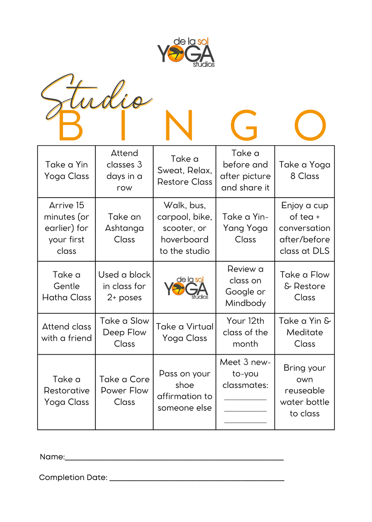 Note: You cannot ask a teacher to do certain poses that may be on your card, and if your card states to take a class, that refers to a specific class on the schedule, ie. if your card says “Take a Yin Class”, a “Yin-Yang” class or “Yin and Meditate” does not count as it is a different class entirely.